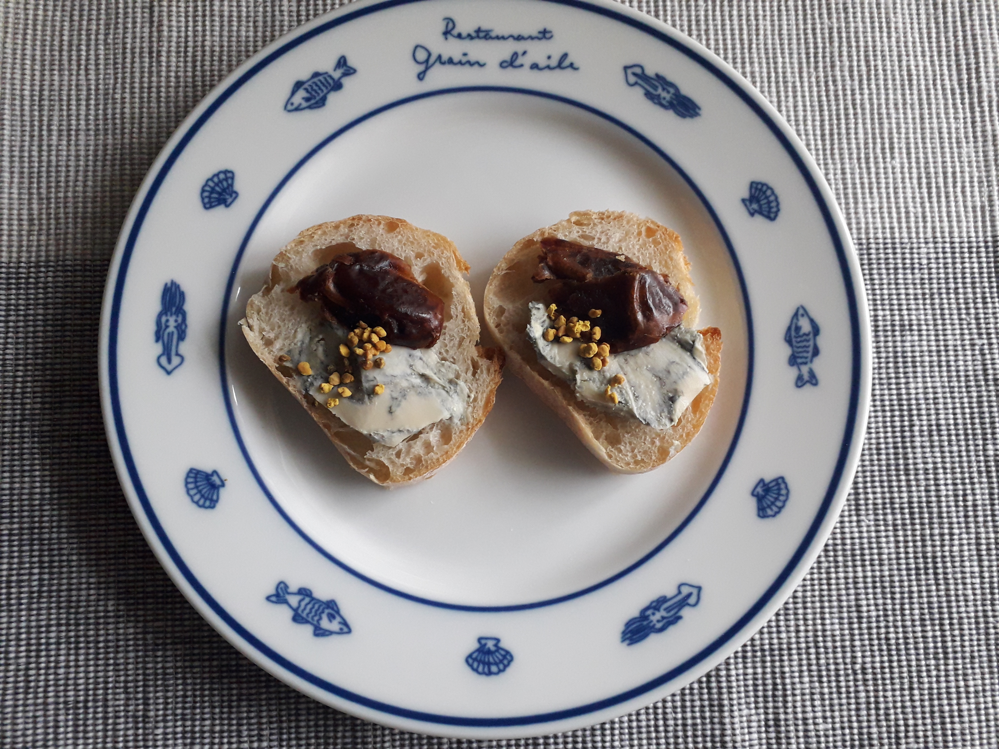 ゴルゴンゾーラに甘いデーツを合わせるとフルーティーさが増して、ワインによくあいます。ビーポーレンの香ばしさも合わさって◎