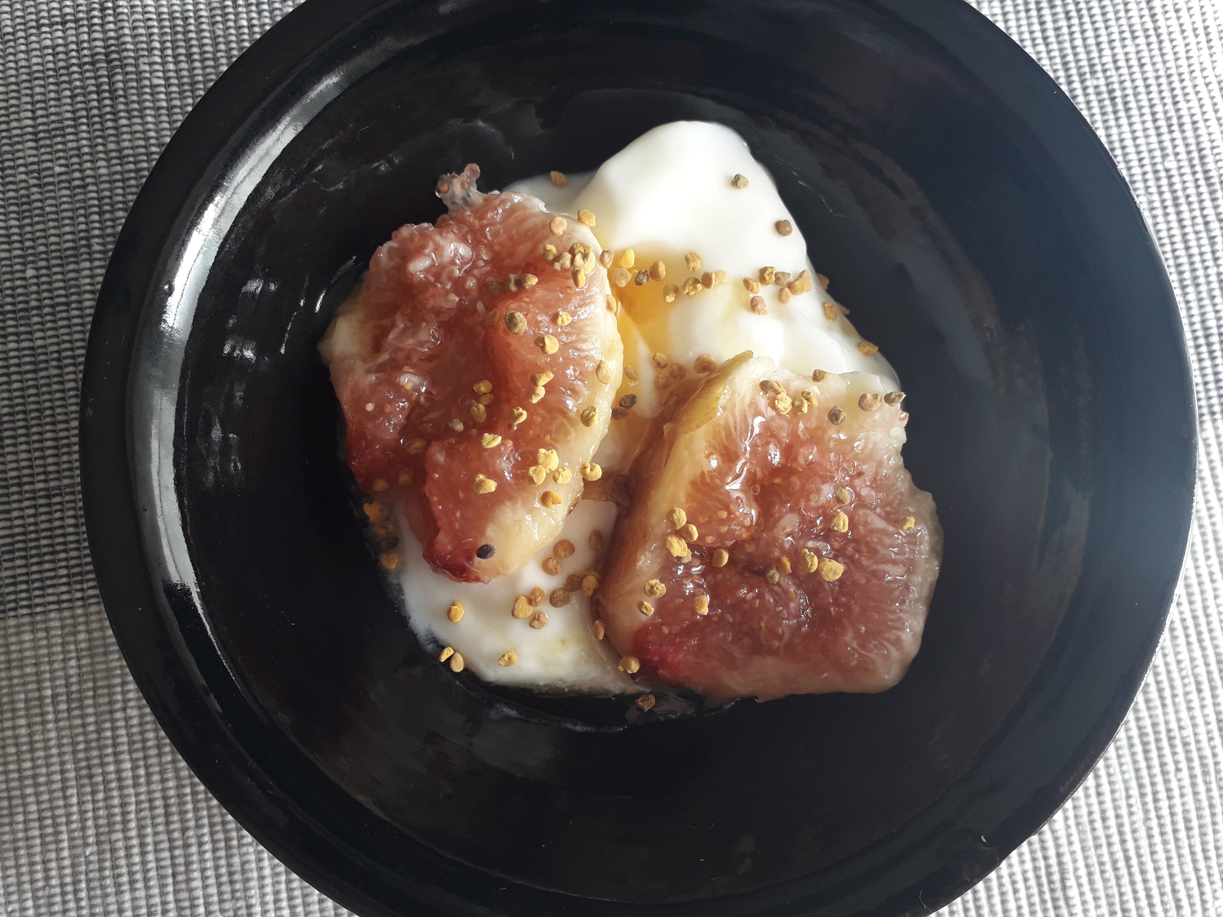 よく熟れたいちじくにヨーグルトとはちみつをかけ、ビーポーレンをトッピングする。